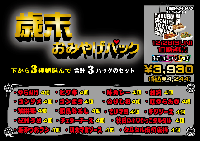 丸武商店2025年年内最終営業日の12月28日(日)の1日限定で 【歳末おみやげパック】を販売いたします!! なおこちらの商品1点お買い上げごとにお楽しみくじ(参加賞あり)が引けます!! 皆様のご来店お待ちしております。