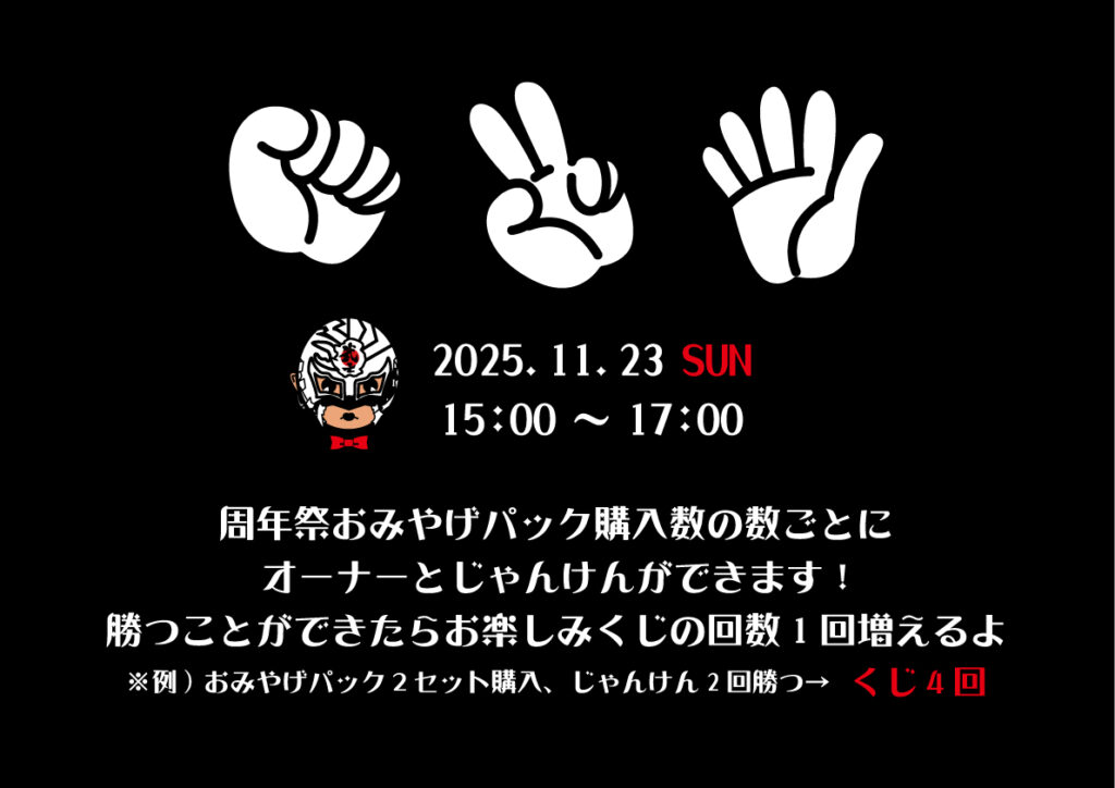 ※ 12周年限定おみやげパックお買い上げの方はおみやげパック購入するごとにBUSHIオーナーとじゃんけんができます